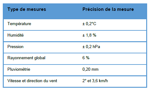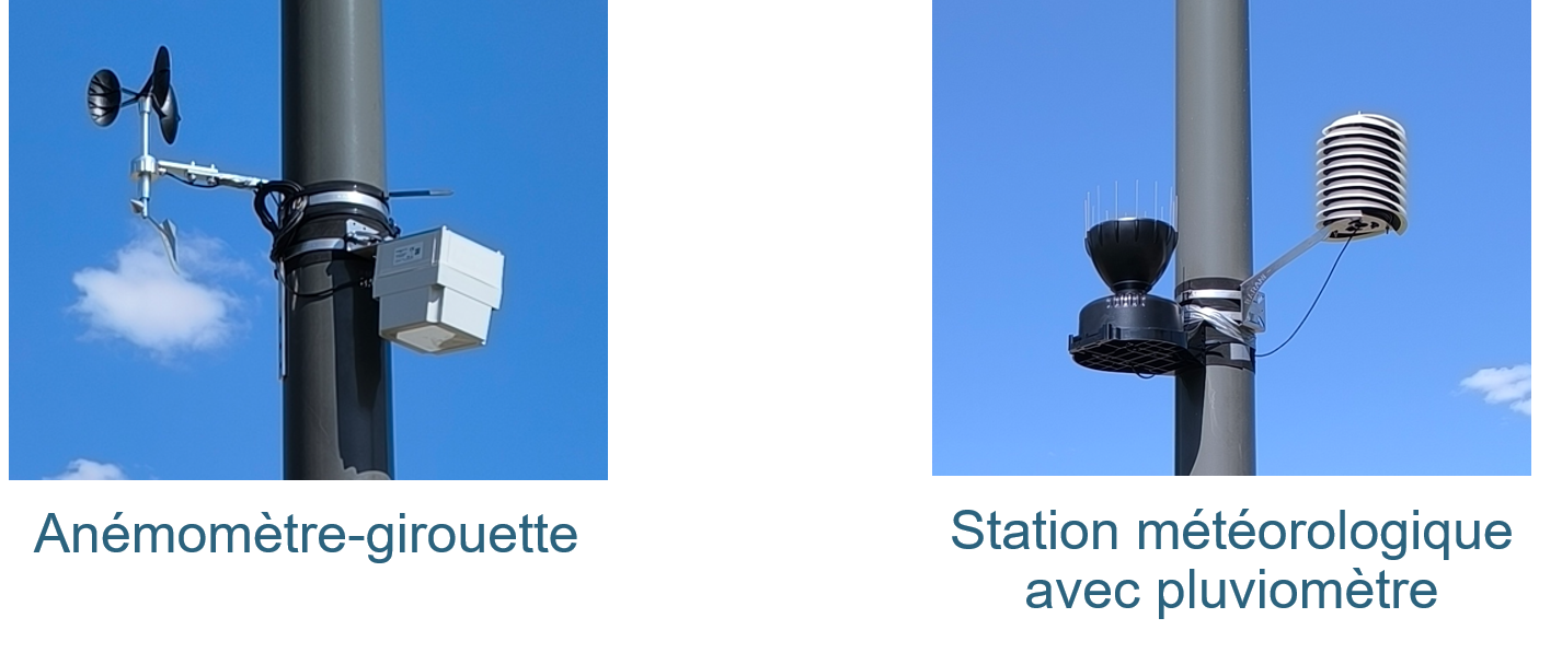 Le réseau utilise des capteurs météorologiques de modèle identique, à savoir la station METEOHELIX® IoT Pro commercialisée par l’entreprise Barani. Ces stations autonomes énergétiquement sont de petite taille (22,6 cm par 17 cm), pèsent seulement 1,2 kg et présentent pour l’ensemble des variables mesurées une excellente précision. Les anémomètres-girouettes sont de modèle METEOWIND® IoT Pro commercialisé également par l’entreprise Barani tandis que le pluviomètre est issu du catalogue de l’entreprise Davis.